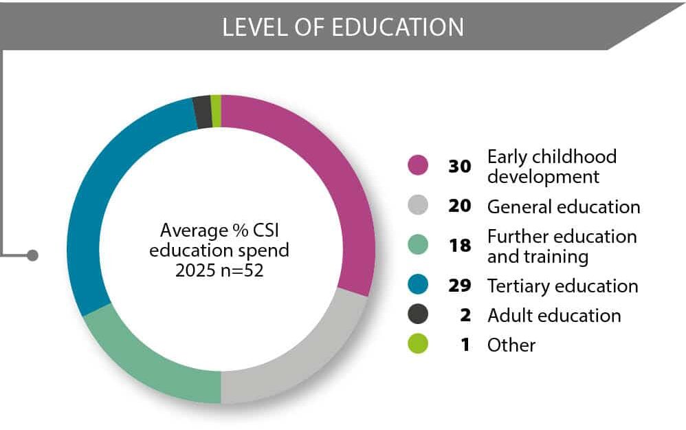 - Vocational and technical education (4%), financial literacy (3%) and life skills (1%) continued to receive the smallest share of average CSI education spend.