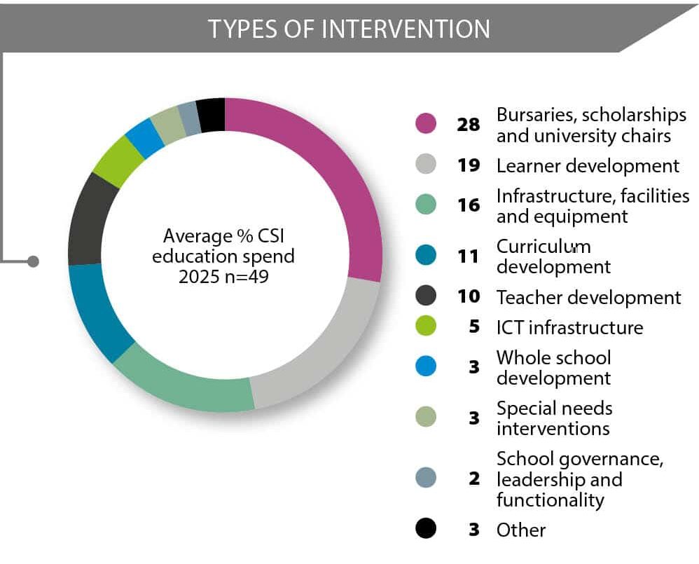 - Bursaries, scholarships and university chairs remained the most supported intervention type in the education sector, with average CSI education expenditure increasing slightly from 24% in 2024 to 28% in 2025.